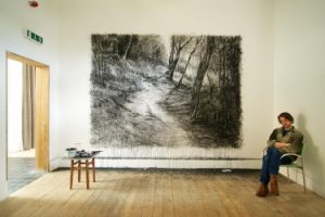 The themes of ‘comfort zone’ are the notions of memory and nostalgia. The inherent permanence and sometime transience of these are intrinsically questioned by the temporary large-scale drawing itself, knowing it and all its efforts will vanish in a matter of weeks with only memory to hold it. This is the main focus of the installation: the temporary nature of memory. Over time memory is distorted or erased; through erasure the desire for permanence surfaces in a simple picture.