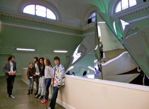 The one and only Wacky (Karl) gave us a constant source of entertainment throughout the day. After our tea we dosed off and went up to a piece by Wang Du. One thing that I thought was good at D.C was how most of the pieces were interactive. Visitors to Dublin Contemporary can actually jump, walk or run on this giant cradle which is roughly the size of a basketball court. Newspaper designs are printed onto its sheets and pillows and international news broadcasts are shown on TV’s hanging from the ceiling.